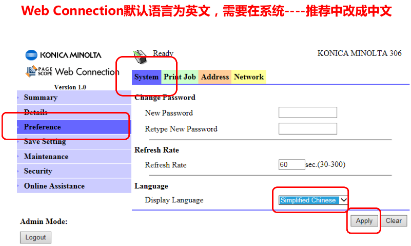 1)PC中打開(kāi)IE輸入MFP的IP地址,通過(guò)PSWC進(jìn)入管理員模式(管理員密碼:sysadm)