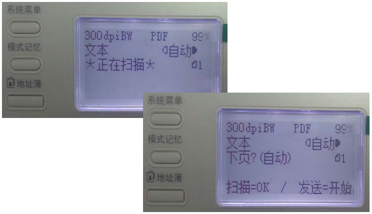 7)如果需要繼續(xù)掃描下一頁(yè),則按“OK”,繼續(xù)掃描下一頁(yè);如不需要繼續(xù)掃描,則按“開(kāi)始鍵”進(jìn)行發(fā)送